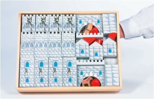3 years & up. Build your own dream castle with these enchanting, artistic wooden blocks. This unique castle set includes 46 wooden pieces with detailed graphics, and medieval characters - everything a child needs for days and "knights" of endless imaginative enjoyment! 11 3/4" x 15" x 2 1/2".